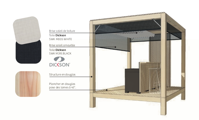Eden est fabriqué en pin douglas. Le principal avantage de cette essence de bois est sa durabilité naturelle. Elle offre également d’excellentes qualités esthétiques et assure un aspect chaleureux et confortable.